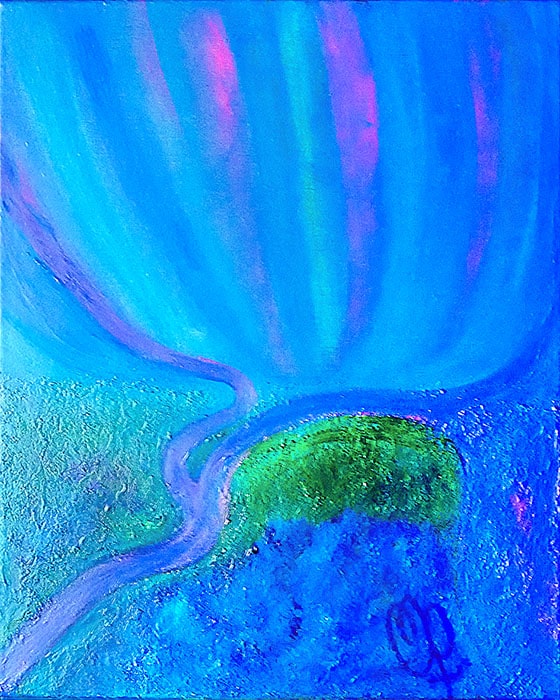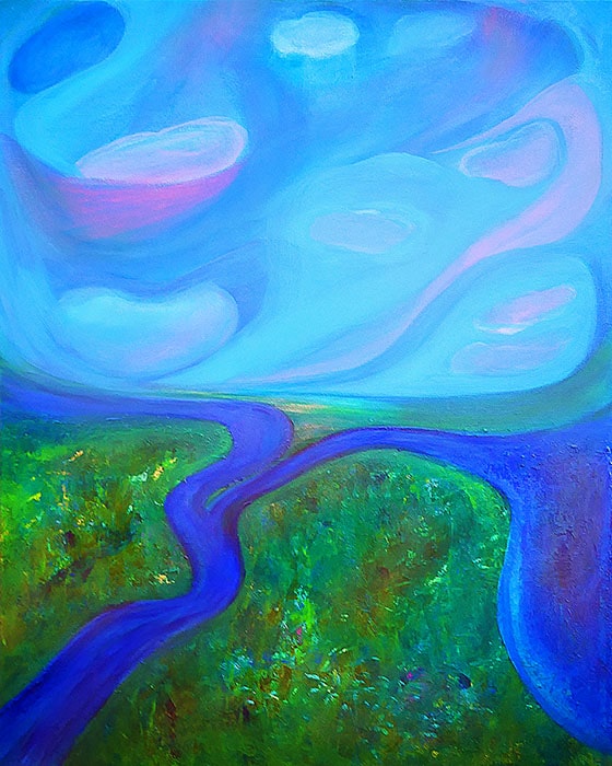 Картины: «Под голубыми Небесами», «Сфера РА», «ВРАта в РАй», «Солнце Шамбалы», «Моё Средневековье» объединились в единую композицию не только цветом, но и глубиной смыслов.